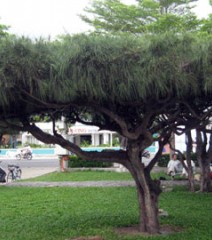 Phi-lao thuộc loại cây gỗ trung bình, cao 15 - 25 m, mang hoa đơn tính cùng cây. Hoa đực tập trung ở đầu cành, lúc nở, nhị có màu vàng nâu khiến cho toàn cây như bị khô cháy