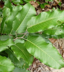 Cây thường xanh, cao 30 - 40m, thân thẳng. Vỏ màu xám nâu, thịt màu vàng, rãnh sâu. Cành thô, dẹt, hay có góc và có lông màu vàng đất. Lá đơn mọc cách, phiến lá thuôn hay hình bầu dục thuôn, gốc lá tròn hay gần hình tim, đỉnh có mũi tù ngắn, mặt trên nhẵn, mặt dưới có nhiều lông nhỏ, gân bên 20 - 24 đôi, nổi rõ ở mặt dưới, cuống lá 13 - 16mm. Lá kèm hình mác rất nhỏ có lông.